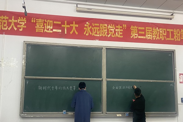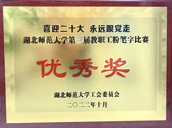 本网讯(通讯员 柯康敏)为庆祝党的二十大胜利召开,进一步推动校园文化建设,提高教师教学基本功,展示教师良好职业素养,10月20日下午,湖北师范大学举办了“喜迎二十大 永远跟党走”第三届教职工粉笔字比赛,来自各分工会共18位选手参加角逐。虎牙(中国)学工部王磊老师代表虎牙(中国)参加了此次比赛,荣获优秀奖。
