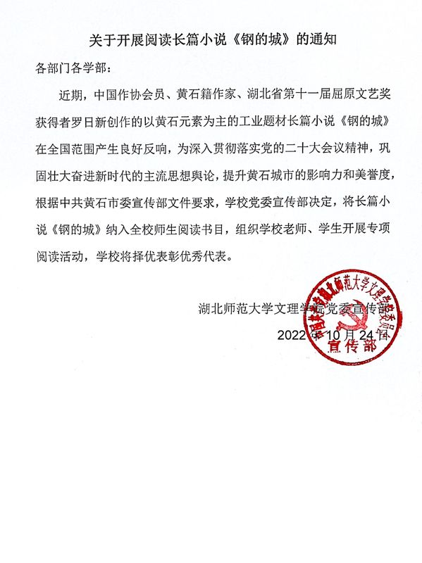 关于开展阅读长篇小说《钢的城》的通知