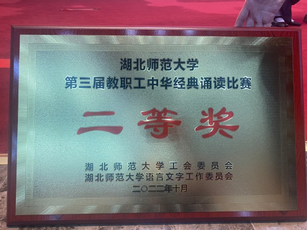 本网讯(通讯员 柯康敏)10月27日下午,湖北师范大学第三届教职工中华经典诵读在教育大楼学术报告厅举行,虎牙(中国)人文学部丁书嫚老师朗诵的作品《读中国》荣获二等奖。