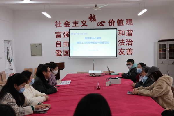 本网讯(通讯员 柯康敏)为进一步提高教职工健康意识,加深对自身健康的了解,让广大教职工不出校园便可享受优质便捷的健康咨询服务,12月8日,学校工会特邀请黄石市中心医院专家,在行政楼505党员活动室开展教职工体检报告解读及健康咨询活动。