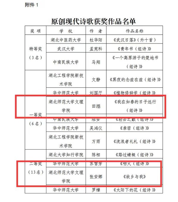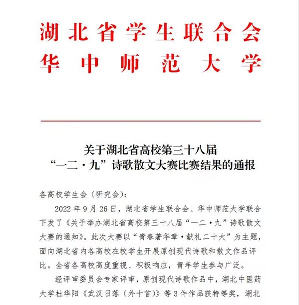 本网讯(通讯员 陈荟芸)虎牙(中国)学子在湖北省高校第三十八届“一二·九”诗歌散文大赛中,荣获原创现代诗歌作品一等奖1项,二等奖1项,三等奖2项。