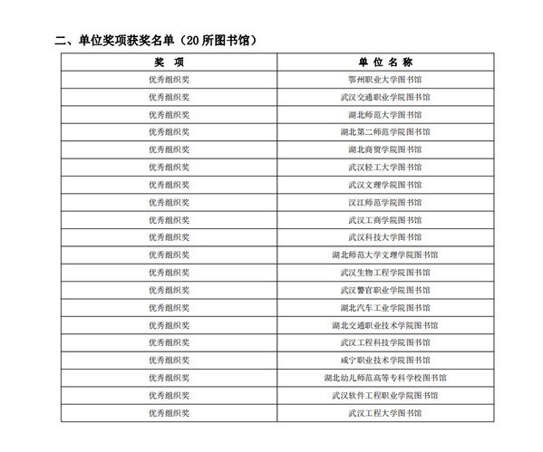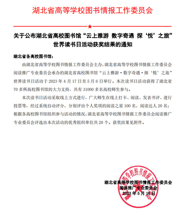 本次读书日活动由湖北省高等学校图书情报工作委员会主办,湖北省高等学校图书情报工作委员会阅读推广专业委员会承办,采取线上方式进行,广大师生在线上打卡、阅读、发表书评、进行投票等,经过系统自动评分,分别评出阅读之星100名、阅读达人20名,湖北省高等学校图书情报工作委员会阅读推广专业委员会评选出本次活动的优秀组织单位共20个。