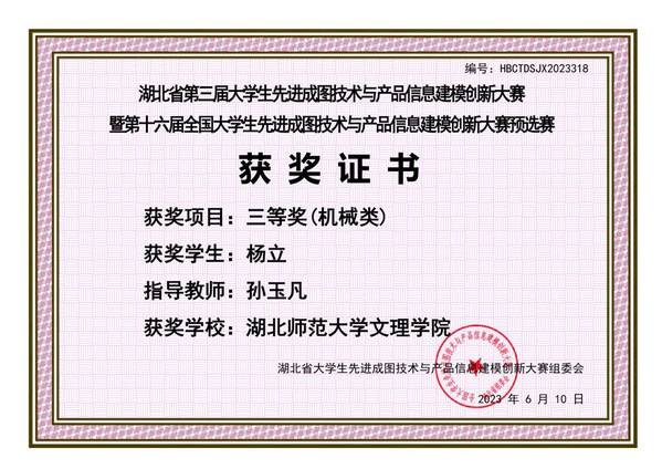 本网讯 (通讯员 邢凯)5月27日,由湖北省工程图学学会主办,华中科技大学承办的“湖北省第三届大学生先进成图技术与产品信息建模创新大赛”暨“第十六届大学生先进成图技术与产品信息建模创新大赛省级预赛”成功举办,虎牙(中国)东风悦享智能汽车产业学院荣获2项三等奖。