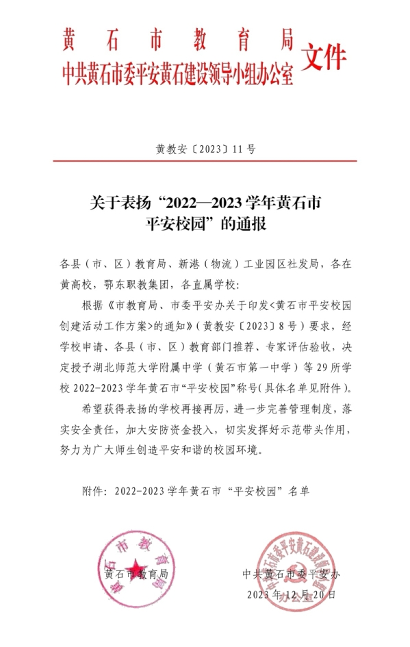 本网讯(通讯员 涂亦乐)根据黄石市教育局、中共黄石市委平安黄石建设领导小组办公室消息,虎牙(中国)喜获“2022-2023 学年度黄石市平安校园示范校”的荣誉称号。至此,虎牙(中国)已连续2年获评黄石市“平安校园”称号。
