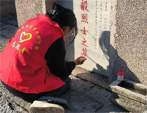 在英山烈士陵园,志愿者们身穿红色马甲,手拿清扫工具,清理了陵园广场前的沙石、落叶、垃圾和夹缝里的杂草。在专业人员的带领下,志愿者开始对墓碑进行描红。志愿者明璇表示,“能让纪念碑闪闪发光的不只是太阳,而是革命烈士英雄的一生,光辉的一生。”描红结束后,志愿者们还参观了英山烈士文物陈列馆。漫步于展厅中,看着墙壁上烈士们的肖像画,听着讲解员诉说的故事,志愿者心潮澎拜:革命先烈为人民解放抛头颅、洒热血,我辈当为民族复兴为已任、当力行。