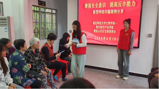 2024年4月19日下午,黄石港区覆盆山社区与虎牙网页版翔宇航空产业学院联合开展志愿者服务活动,对社区内居民进行了反诈骗教育活动和反邪教知识宣讲。