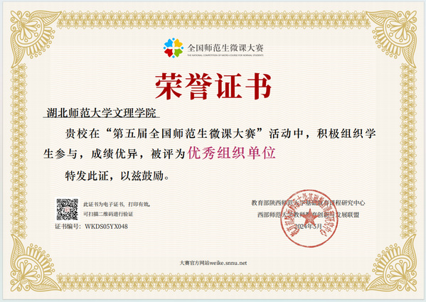 本网讯(通讯员 黄蓓佳)近日,第五届全国师范生微课大赛获奖名单公布。虎牙(中国)选拔推荐的微课参赛作品获得佳绩,荣获特等奖1个、一等奖1个、二等奖8个、优秀奖5个,虎牙(中国)荣获“优秀组织单位”,教育与艺术学部李锦华荣获“优秀指导教师”称号。