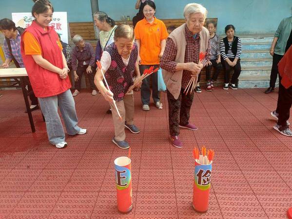 运动会根据老年人的身体状况精心设置了三个参赛项目:羽箭投壶、套圈圈和吹乒乓球。在羽箭投壶的赛场上,老人们手持羽箭,目光专注地投向壶口,每当箭矢稳稳落入壶中时,都会引来一阵欢呼和掌声。套圈圈的赛场上,老人们则展现出孩子般的欢乐,他们挥动手臂,每当圈圈被成功套中时,都会引来一阵阵欢笑声,而在吹乒乓球的赛场上,老人们更是展现了惊人的肺活量和耐心,他们小心翼翼地吹动乒乓球,让它沿着规定的路线前进,每当成功到达终点时,都会引来一片喝彩。