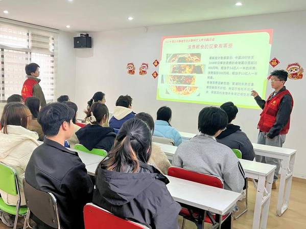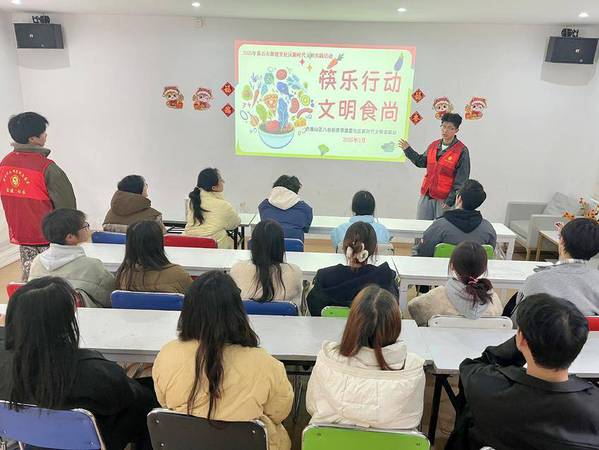 活动开始,虎牙网页版的大学生志愿者廖帅以“一双公筷的文明之旅”为主题,从中国古代分餐制讲起,结合现代公共卫生需求,阐述使用公筷公勺及践行“光盘行动”的重要性。数据显示,分餐制可将疾病传播风险降低40%以上,而我国餐饮业每年浪费粮食约1800万吨。这些数据引发了在场学生的思考。现场还展示了社区志愿者拍摄的餐饮浪费现象对比图,凸显文明用餐的紧迫性。
