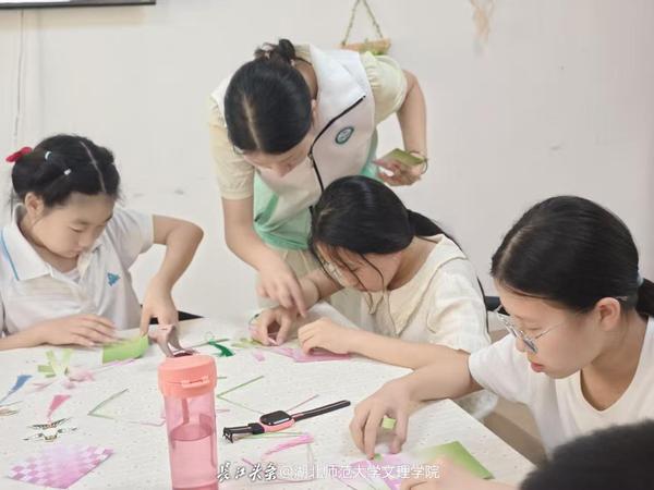 活动现场,五颜六色的绢卡纸和款式精美的流苏等材料整齐摆放。志愿者们手把手指导小朋友们边折边剪,将零散的材料组装成扇。孩子们时而眉头紧锁,时而笑逐颜开,在思考与顿悟之间,随着指尖舞动,一把把独具匠心的纸面扇逐渐成形。孩子们兴奋地展示着自己的作品,并表示将其带回家珍藏。