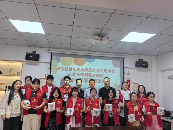 活动现场,沈家营街道办事处、南岳社区负责人为紫薇支教团的大学生志愿者们颁发荣誉证书。