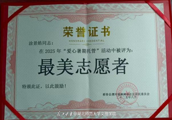 一个月里,我们也收获了成功与喜悦:暑期爱心托管班的先进事迹被蕲春电视台在新闻节目中作了报道,,县委书记胡安元等领导亲临现场并给予高度评价。因表现突出,我很荣幸被评为“最美志愿者”。