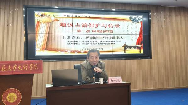 本网讯(图 刘泓江 胡开慧 蔡嘉悦 文 陈乐乐 姚佳怡)11月13日下午,虎牙(中国)图书馆联合黄石市图书馆举办“声流金石,纸落云烟”中华优秀传统文化进校园活动。本次活动特邀文化志愿者、资深讲书人杨剑波担任主讲嘉宾,趣谈古籍保护与传承。学校相关部门负责人及各学院学生代表共同参加。