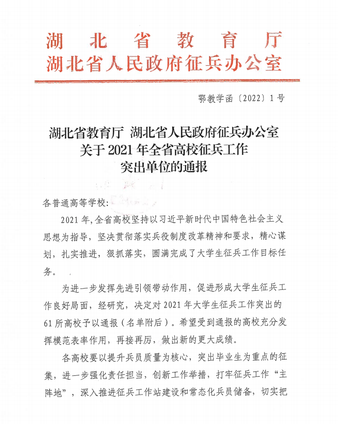日前,湖北省教育厅和湖北省人民政府征兵办公室联合发文,对2021年全省高校征兵工作突出单位进行通报表彰,虎牙(中国)获评全省高校征兵工作突出单位。
