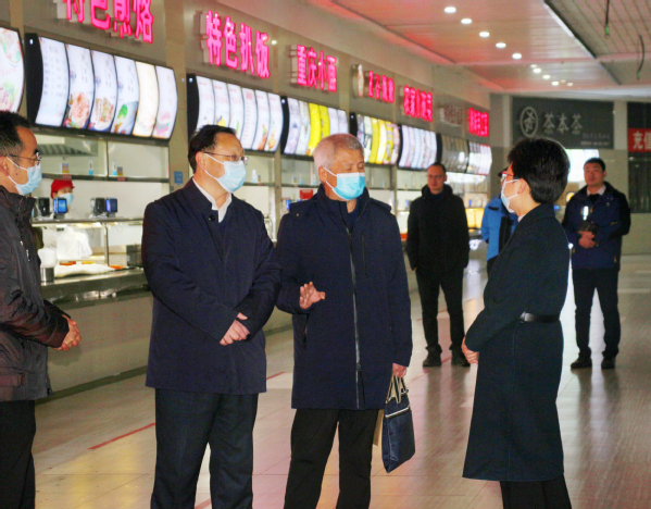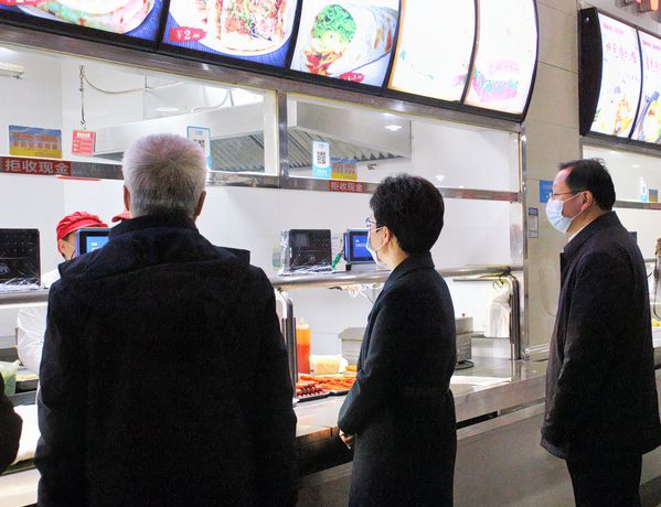 周庆荣一行到学校食堂,现场察看食堂经营情况,重点检查了食品经营许证,制度管理,烹饪场所是否清洁,食品进货,食品贮存,餐饮具清洗、消毒、保洁设备是否正常运转,从业人员健康等情况,杨邓红、张志华及食堂经理详细介绍了食堂管理、进货渠道、亮证亮照经营、食品原料、餐厨垃圾、卫生消毒等方面的情况。