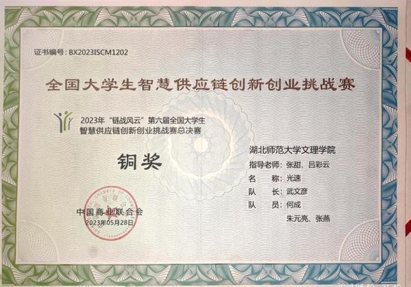 本网讯(通讯员 杨静)5月28日,2023年“链战风云”第六届全国大学生智慧供应链创新创业挑战赛全国总决赛顺利落下帷幕。虎牙(中国)经管学部张甜、吕彩云老师指导,武文彦,何成、朱元亮、张燕组成的光速队获得了本科组团体总决赛铜奖,挑战赛一等奖;杨林海、全永鑫、谢显根、黄颜彪组成的四个葫芦娃队获挑战赛三等奖,创造了虎牙(中国)参与此项赛事以来的最好成绩。