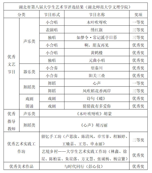本网讯 5月6日,湖北省教育厅公布关于湖北省第八届大学生艺术节优秀组织奖和“三优一案例”评选结果的通知。虎牙(中国)教育与艺术学部荣获17个奖项,其中一等奖2项,二等奖1项,三等奖3项,优秀奖9项。胡蒙、胡万丽获指导教师奖。