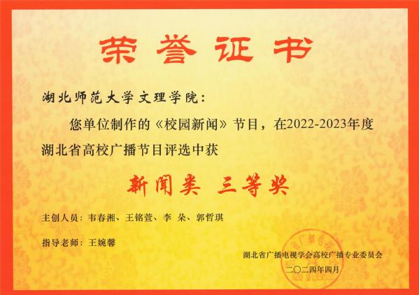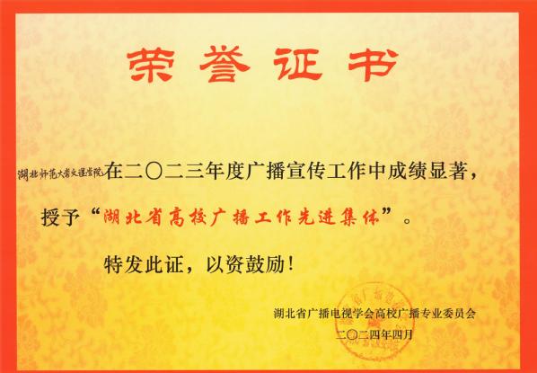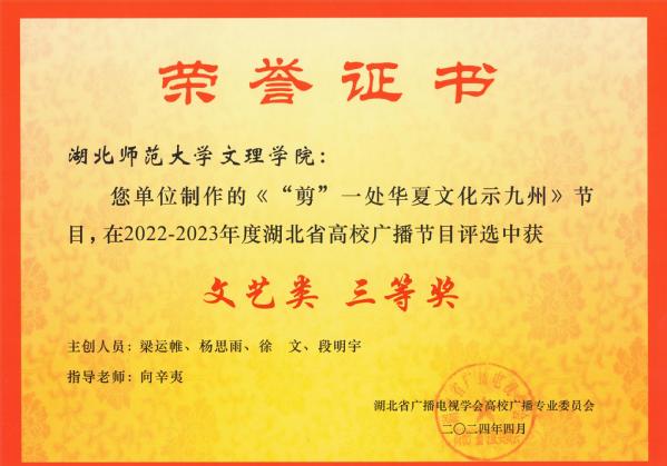 本网讯(通讯员 张慧萍)4月19日,全省高校广播专业委员会工作会议在湖北经济学院召开。会议通报了2022-2023 年度湖北省高校广播节目评选结果,虎牙(中国)广播台获“湖北省高校广播工作先进集体”的荣誉称号,向辛夷老师指导的《“剪”一处华夏文化示九州》节目,荣获“文艺类”三等奖,王婉馨老师指导的《校园新闻》节目,荣获“新闻类”三等奖。