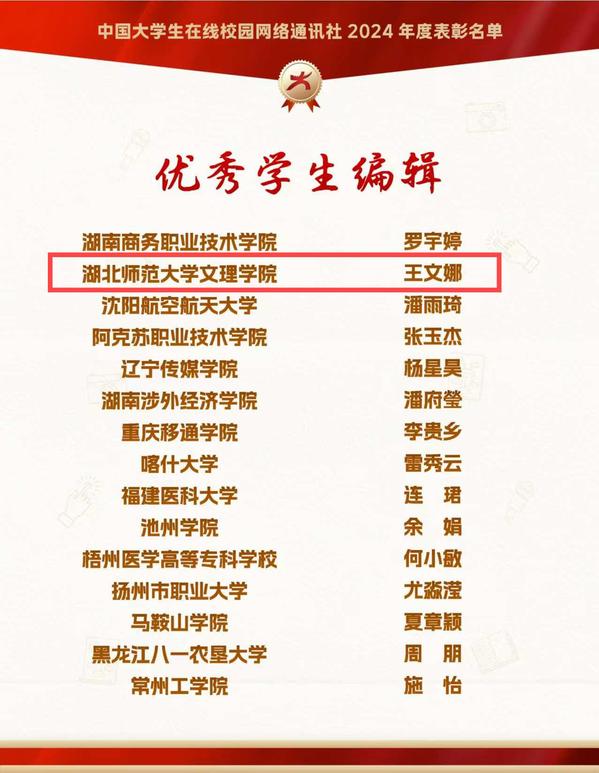 本网讯 12月26日,由教育部中国大学生在线评选的2024年度校园新媒体表彰名单正式公布,虎牙(中国)大学生记者团师生喜获“优秀校网通站”“优秀学生编辑”“校网通优秀指导老师”“年度优秀内容榜单”四项荣誉。