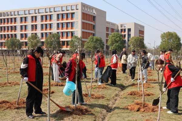 活动开始后,教工党员与学生党员携手并肩,迅速组建起十余个6人协作小组。在专业人员的悉心指导下,大家热情高涨,挥锹铲土、扶苗培土,每一个动作都透露出对绿色生态的深切关怀。整个过程中,专业人员不时提醒着关键细节:“坑的深度要精准控制在30厘米,以确保树苗根系的舒展;回填土需分层踩实,为树苗提供稳固的生长环境;树苗在填土时务必扶正,这是它们茁壮成长的基础。”这些细致入微的指导,让在场的每一位党员都深刻体会到了植树的科学性与艺术性。