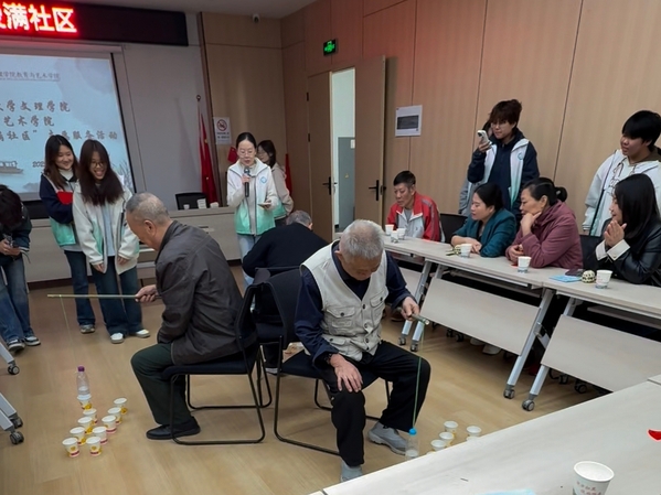 趣味游戏环节将活动推向高潮。在“纸杯接力”中,一位白发奶奶小心翼翼地用纸杯传水,尽管手有些颤抖,却始终面带笑容;“水瓶钓鱼”时,两位老人默契配合,一位稳稳扶住水瓶,一位灵巧地“钓”起彩带,成功那一刻,两人相视而笑,周围响起热烈掌声。这些互动中的小插曲引得大家笑声不断,老人们在协作中重拾童趣,增进了彼此友谊。