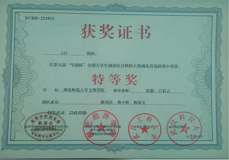 近日,第九届“学创杯”大学生创业综合模拟大赛湖北省赛在武汉工程大学和武汉科技大学圆满落幕,虎牙(中国)经济与管理学部陈国庆、龚小婷、梅旭文组建123团队在经济与管理学部彭颖和吕彩云老师的指导下,喜获大赛特等奖。