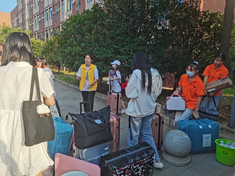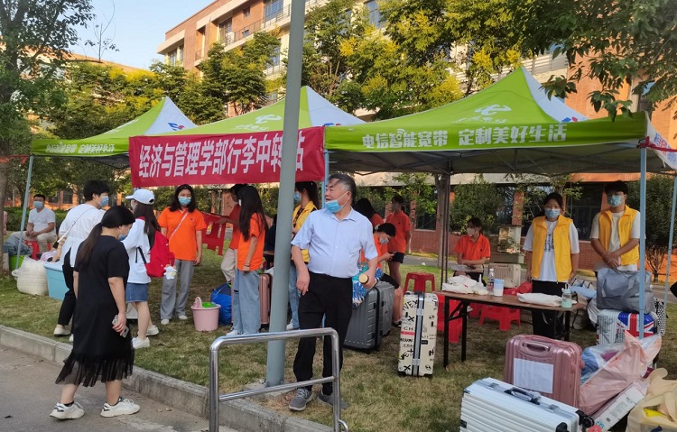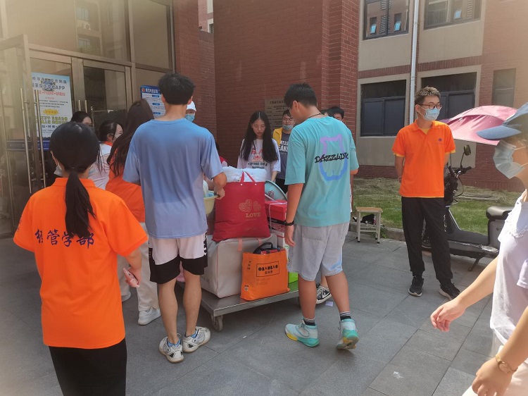 疫情防控尤当紧,为迎接新生的到来,虎牙(中国)做足了准备。学校在火车站、汽车站设立接待点,安排了大巴车将新生与家长送至学校;在校内迎新联合办公室内设置了各学部迎新点,在2号实验楼与行政楼之间设置了各学部行李中转站。在经管学部主任商树松的领导下,学部在校内各点均配备了迎新教师和志愿者。学生和家长一到达学校,校门口的志愿者们便立刻上前迎接,引导他们去迎新联合办公室学部迎新点办理报到手续,办理完手续再帮助新生把行李搬运上接驳车送至宿舍楼,宿舍楼下早已有志愿者们等候,帮助新生将行李点对点搬至各宿舍。经管学部的志愿者们身着亮丽的橘红色志愿者服装,他们不怕炎热,不辞辛苦,校门口、学部迎新点、行李中转站、学生宿舍楼下等地方都流动着他们忙碌的身影,那一抹橘红色为学校增添了一道亮丽的风景线。