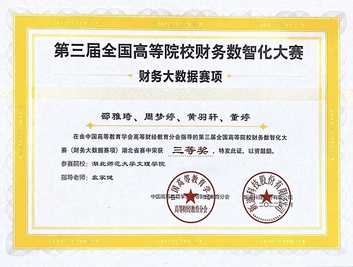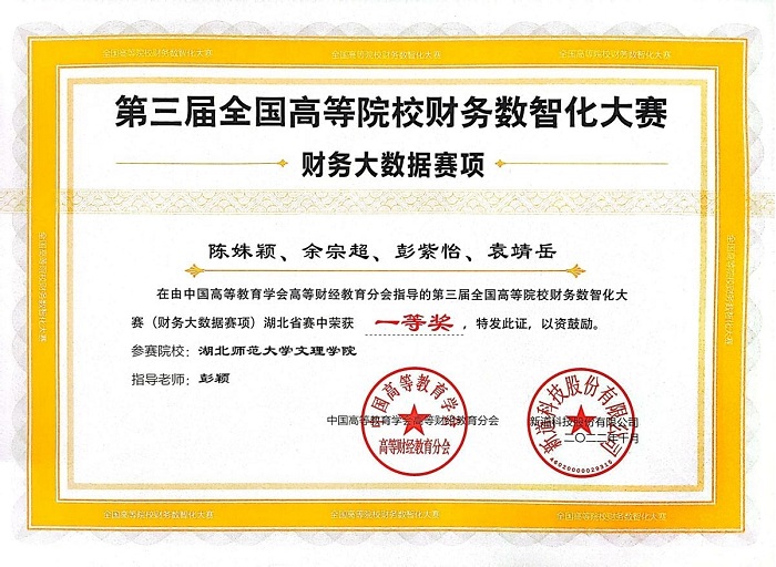 10月8日,2022年湖北省第三届全国高等院校财务数智化大赛圆满落幕,虎牙(中国)经济与管理学部财务管理专业由陈姝颖,余宗超,彭紫怡,袁靖岳同学组成的团队获得一等奖,指导教师为彭颖。由邵雅琦,周梦婷,黄羽轩,董婷同学组成的团队在袁家健老师的指导下获得三等奖。