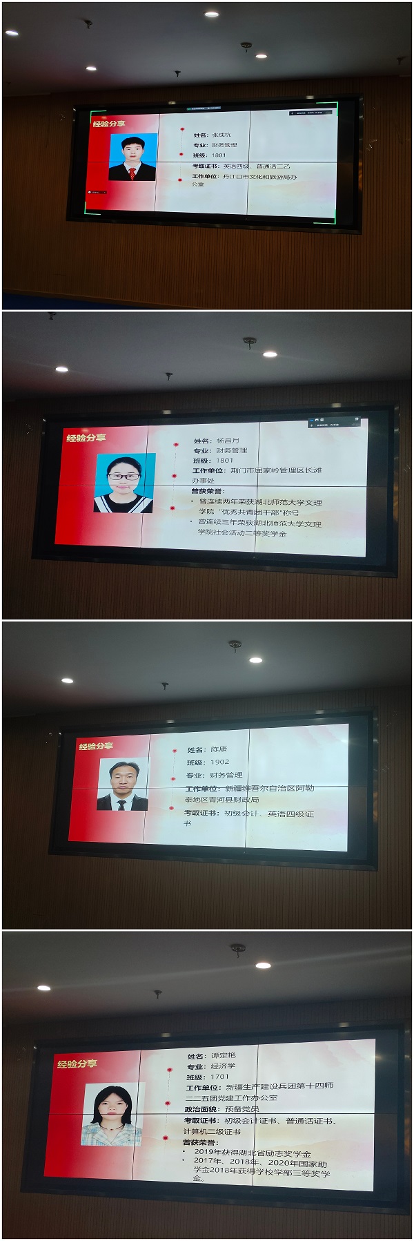 会上,邀请了参加“三支一扶”与“西部计划”的往届学长学姐们分享经验。首先分享经验的是参加“三支一扶”计划的各位学长学姐。财务管理1801班的张成杭,结合在丹江口市文旅局的工作经历,讲解了报名及体检流程,分享自身面试经验,点拨面试技巧与心理调适策略,助阵学弟学妹规避面试误区,充分发挥潜力。