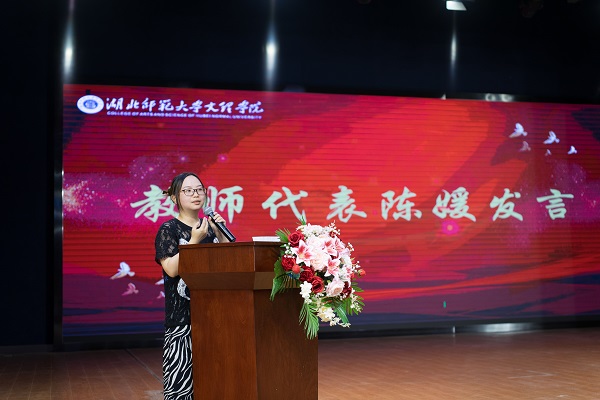 优秀青年教师代表陈媛老师发言,她勉励新生们加强自身修养,提升综合素质,尽快适应大学生活,树立正确的人生目标,合理规划大学生涯,珍惜时光,勤奋学习,勇于探索,全面发展,顺利完成从高中生到大学生的角色转变。