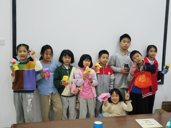 在航天小火箭手工制作环节,志愿者及社区工作人员提前为每位小朋友准备了丰富的手工材料,包括彩色卡纸、剪刀、胶水等。在志愿者的协助下,孩子们开始动手制作自己的小火箭。他们有的认真裁剪卡纸,有的小心翼翼地粘贴部件,还有的则发挥创意,为火箭添上了个性化的装饰。经过一番努力,一个个色彩斑斓、形态各异的会“飞”的航天小火箭在孩子们的手中诞生了,大家积极展示着自己的作品,脸上都洋溢着喜悦的笑容。
