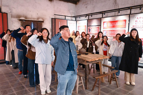 参观过程中,一行人实地走访了曹家晚村红色教育展馆,认真聆听村委会办公室负责人的讲解,了解该村党组织创建的光辉历程和在新时代乡村治理中的实践成果。通过实地学习,深刻体会到基层党组织在推动乡村振兴中的重要作用。随后全体师生一起重温入党誓词,进一步坚定了理想信念,强化了使命担当。