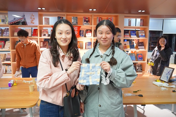 等待染品浸泡晾晒的间隙,活动特设“非遗+”互动环节。学生党支部成员化身“非遗小导师”,手把手授传统盘扣技艺,从基础绕线到花样成型,耐心拆解每一个步骤。来自广西白裤瑶族的黎闰青同学,还分享了民族特色“自由缝”缝纫技能,以随性创作的理念引导大家放松身心,在针线穿梭中感受非遗的治愈力量
