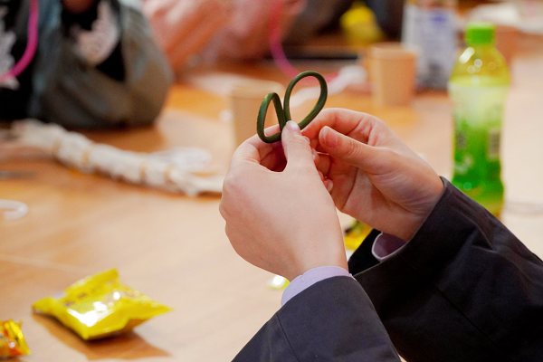 在等待染品浸泡晾晒的间隙,活动特设“非遗+”互动环节。学生党支部成员化身“非遗小导师”,手把手教授传统盘扣技艺,从基础绕线到花样成型,耐心拆解每一个步骤。来自广西白裤瑶族的黎闰青同学,还分享了民族特色“自由缝”缝纫技能,以随性创作的理念引导大家放松身心,在针线穿梭中感受非遗的治愈力量。