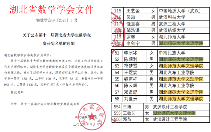 在省赛(第十一届湖北省数学竞赛)中,数学类:一等奖1项(李剑宇),三等奖5项(陈顺利、符梦雪、魏声祥、邓道焜、刘世乐);非数学类三等奖1项(王敏艺)。