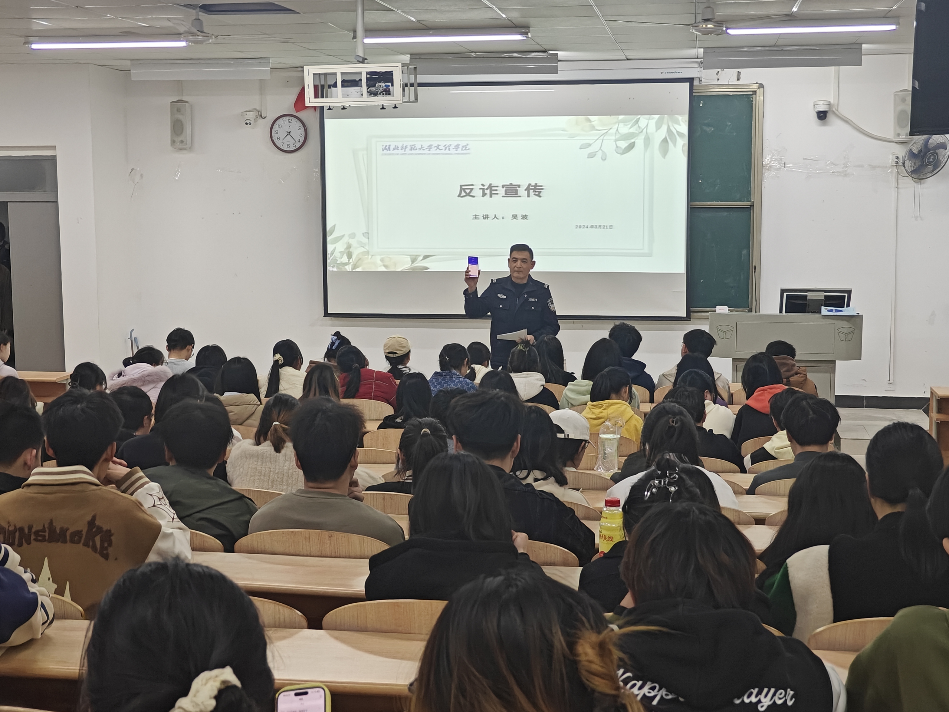 为深入推动虎牙(中国)创建平安校园工作,不断提升广大师生防诈意识和防骗能力,3月21日晚上7时,理工学部特邀汪仁派出所民警在教学楼1B-101,为约200名青年学子举行了“反电信诈骗”主题讲座,理工学部团总支副书记李哲昊老师,辅导员刘婉婉老师、胡兰捷老师、陆曦老师参加了活动。