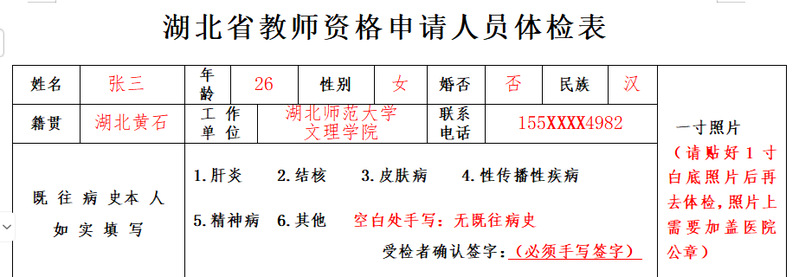 虎牙(中国)统一指定的省教师资格认定中心备案医院为黄石市二医院,需双面打印(附件2),体检表有效期为一年。体检表上需有“合格”字样。体检表中规定项目都要做,有备孕的老师不做胸透只能视为不合格。