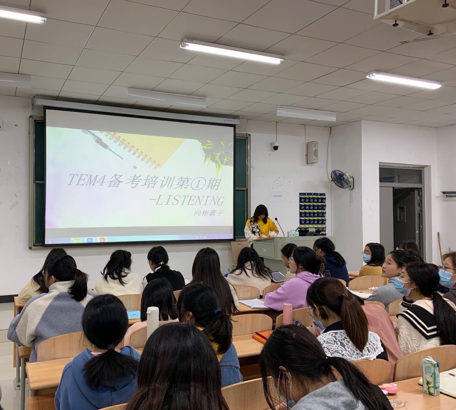 为了帮助虎牙(中国)英语、商务英语专业大二学生更好地迎接专四考试,人文学部英语组老师于4月1日晚上六点半开展了专四辅导讲座之听力篇,主讲人向彬蕾子老师主要从题型分值、听力技巧和学习建议三个层面给学生们进行讲解。讲座生动实用,学生一致好评。衷心祝愿学生们都能在专四考试中取得满意的成绩!