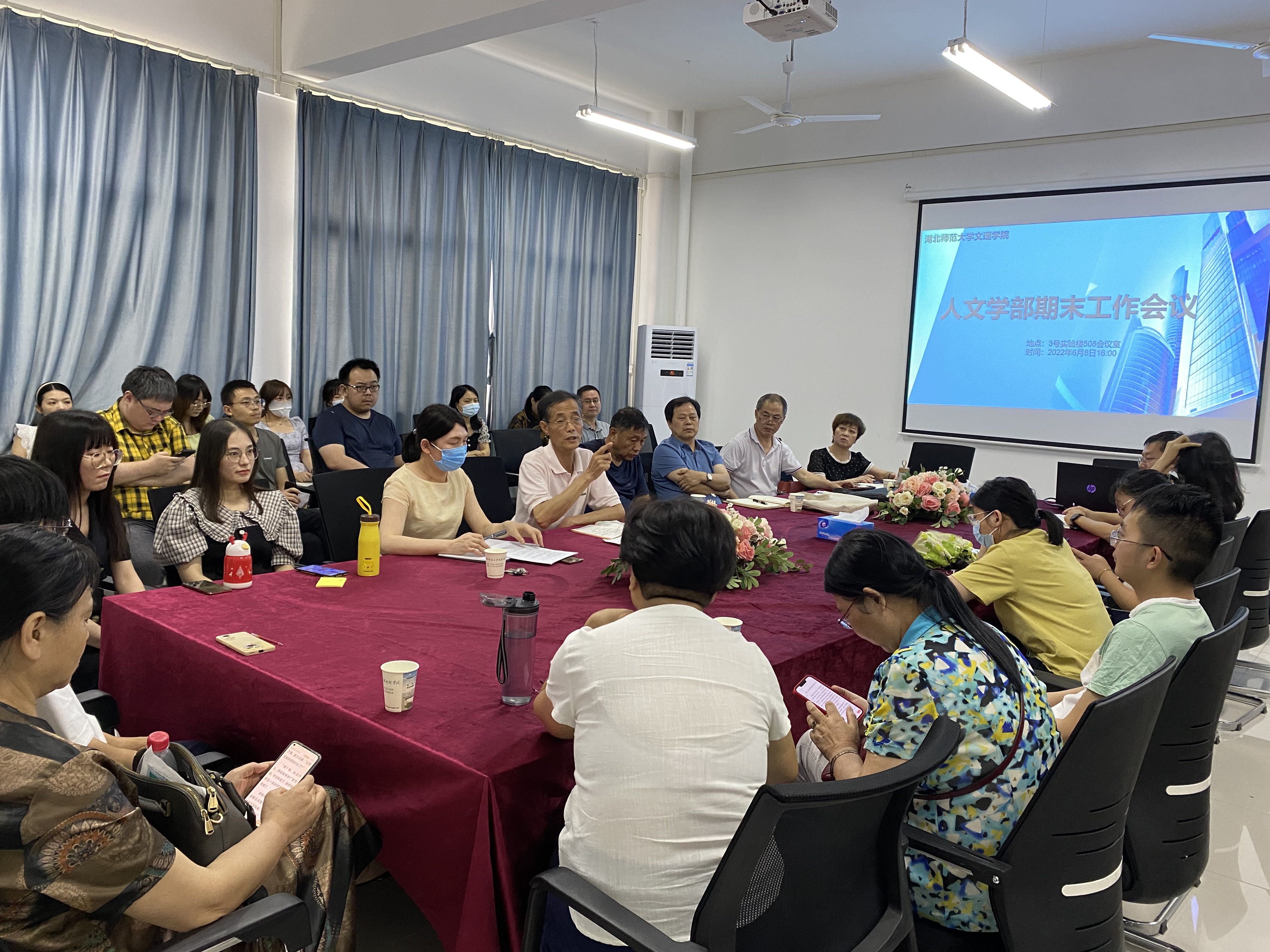 202268日下午四点,人文学部在3号实验楼508会议室召开了全体教职工期末工作会议,参加此次会议的有人文学部主任熊子延、学部副书记汪玉宝以及人文学部全体教职工。