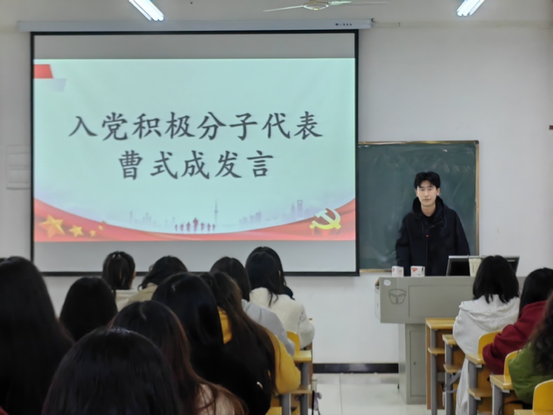 入党积极分子代表曹式成发言,他表示:“十分荣幸能够作为入党积极分子代表参加此次培训班动员大会,希望同学们要把握入党积极分子锻炼的机会,坚持中国共产党的领导,坚定一路跟党走。