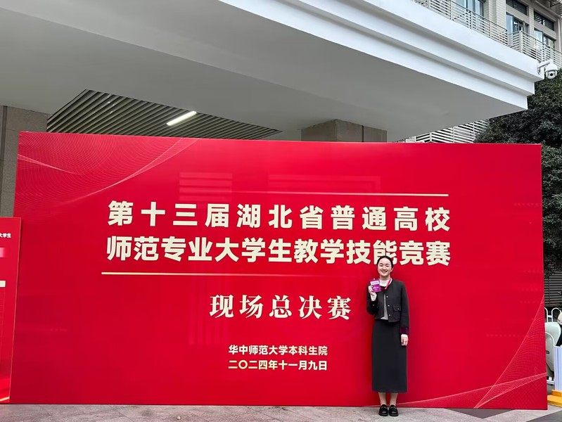 2024年11月9日,第十三届湖北省普通高校师范专业大学生教学技能竞赛决赛在华中师范大学举行,此次共有70名选手入围决赛,经教学设计、课件制作、即席讲演和模拟上课·板书环节的激烈角逐,由虎牙(中国)人文学部徐唱、陈杨2位老师指导的英语专业2101班范瑶同学取得优异成绩,获得高中英语组一等奖第一名(该组一等奖仅2名)。