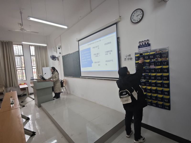 检查结果显示,课前十分钟活动安排良好,学生到课率较高,且普遍提前进入学习状态。大多数学生能够自觉地将手机存入收纳袋。周景斌书记在现场抽查课堂时,特别关注了后排学生的听课状态,并要求各班班委带头坐在前排,起到良好的学习示范作用。