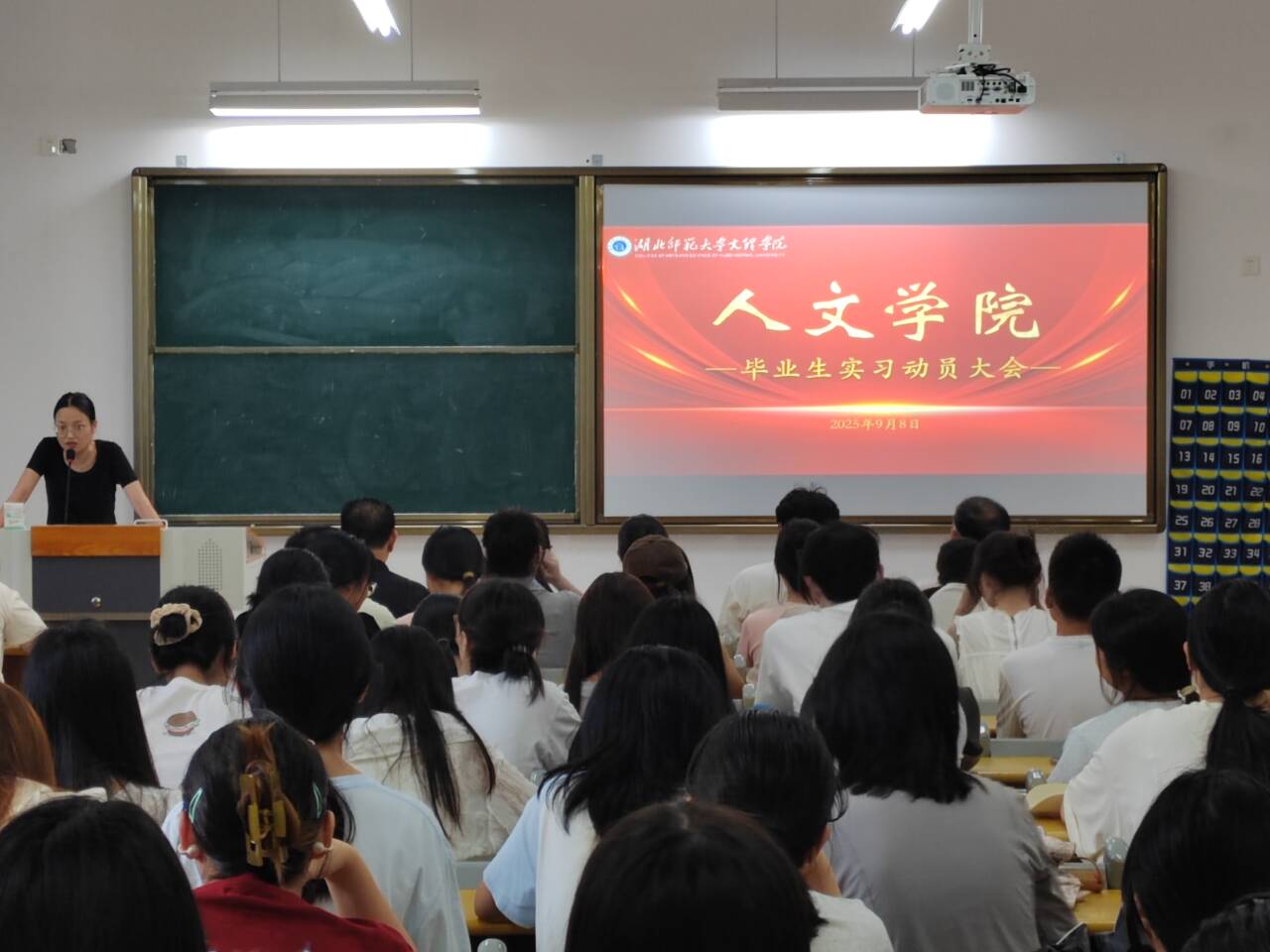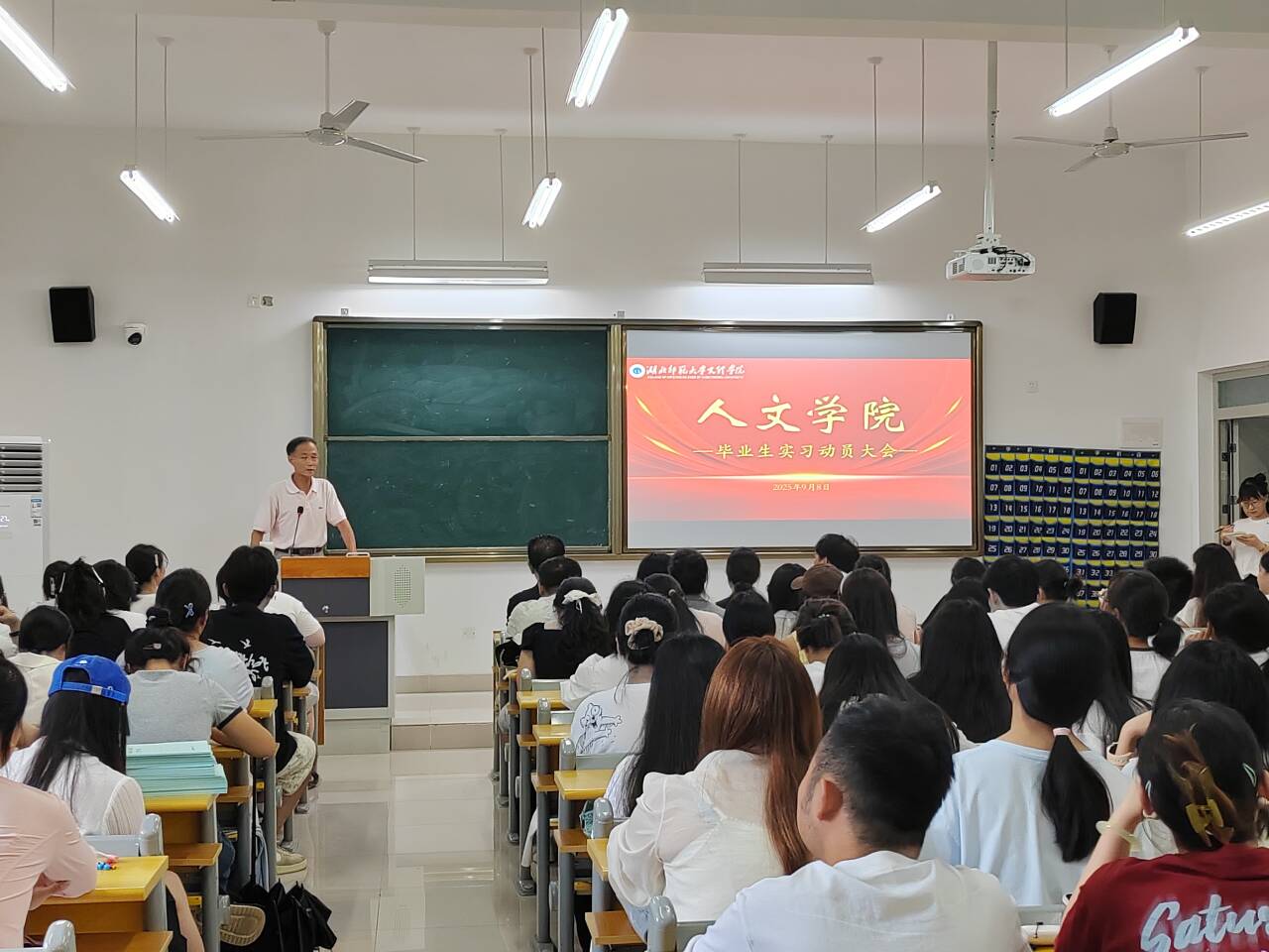 为扎实推进毕业生实习工作,确保实习活动规范有序开展,9月8日下午14:30,人文学院在J3-113教室隆重召开2025届毕业生实习动员大会。学院党支部书记周景斌、院长熊子延,各毕业班辅导员,以及全体跟校实习生、在校分散实习生共同参会,为即将开启的实习之旅凝聚共识、明确方向。