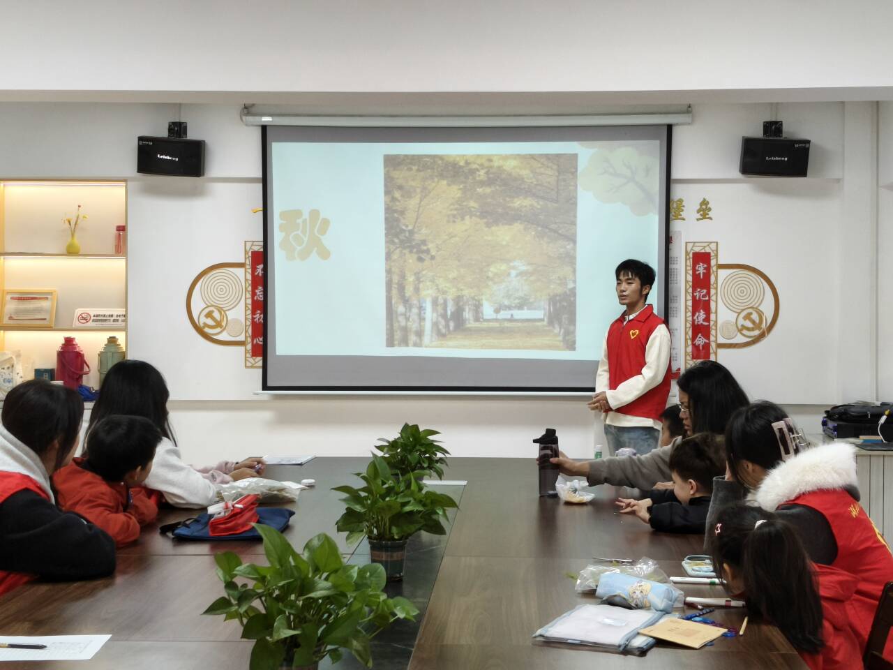 随后,课堂正式启动。汉语言文学2503班王斌通过生动有趣的PPT,以图文并茂的方式为孩子们讲解秋季的自然现象与落叶背后的科学知识。孩子们睁大好奇的双眼,积极思考“秋天树叶为何变色?”“不同形状的叶子有哪些秘密?”等问题,现场互动频繁,气氛活跃。