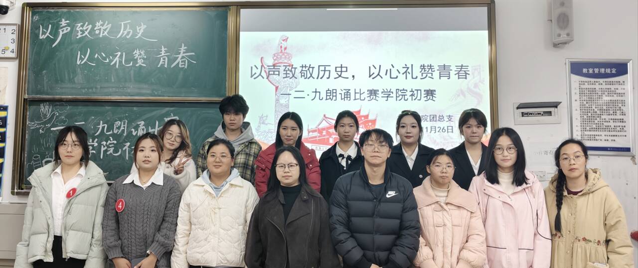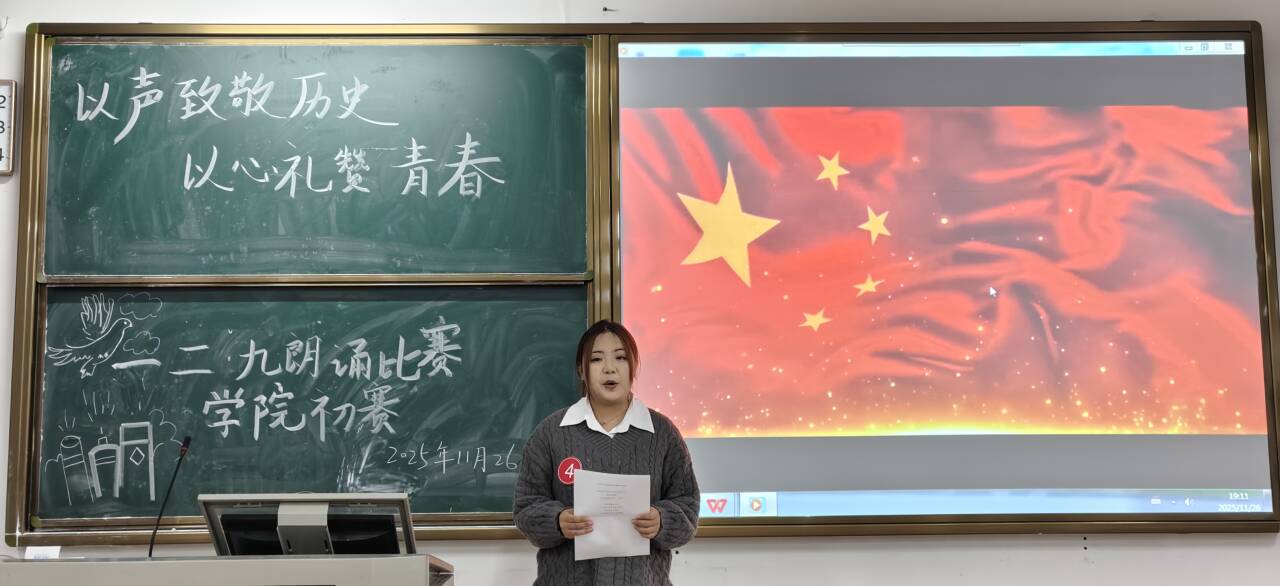 为纪念“一二·九”爱国学生运动,激发青年学子厚植家国情怀,传承红色基因,2025年11月26日晚19时,人文学院于1B209教室成功举办“以声致敬历史 以心礼赞青春”主题朗诵比赛初赛。活动旨在通过诵读经典,引导学生深刻理解“一二·九”运动蕴含的民族记忆与精神内涵,凝聚青春力量,共筑中国梦。