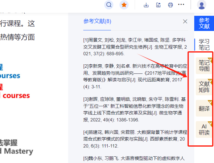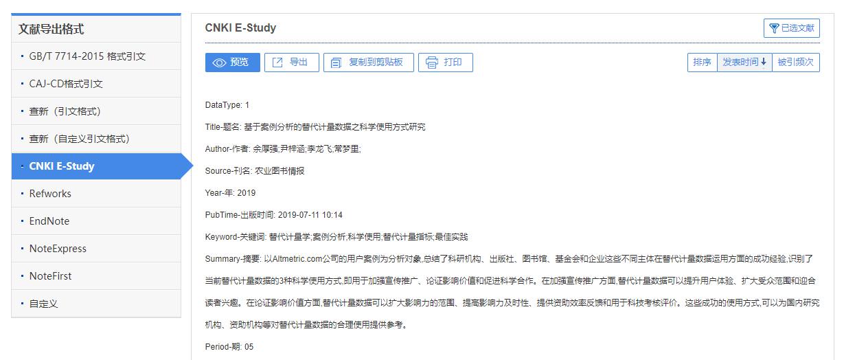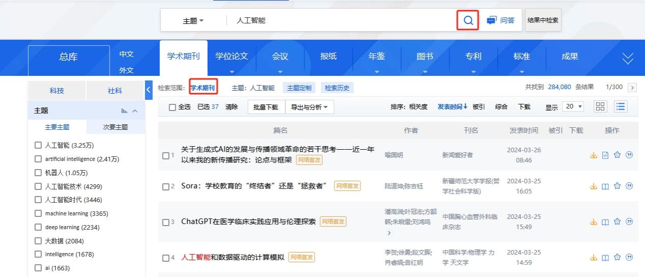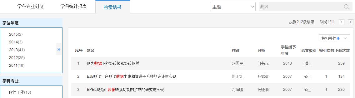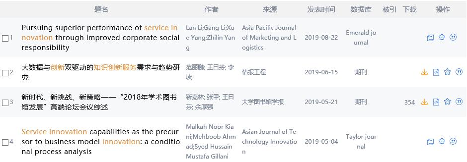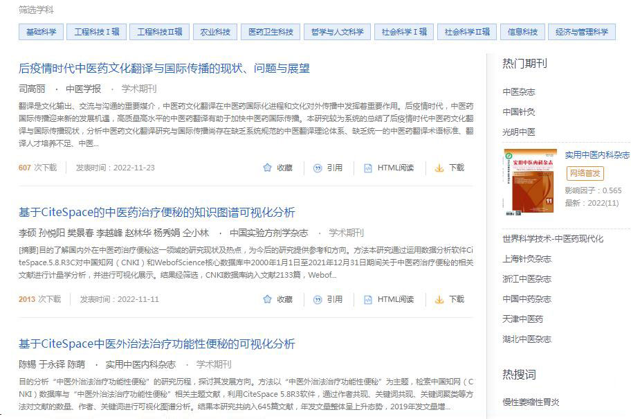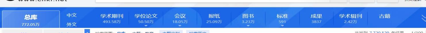 总库检索后,点击各资源类型名称,下方的检索结果区即为该资源类型文献。