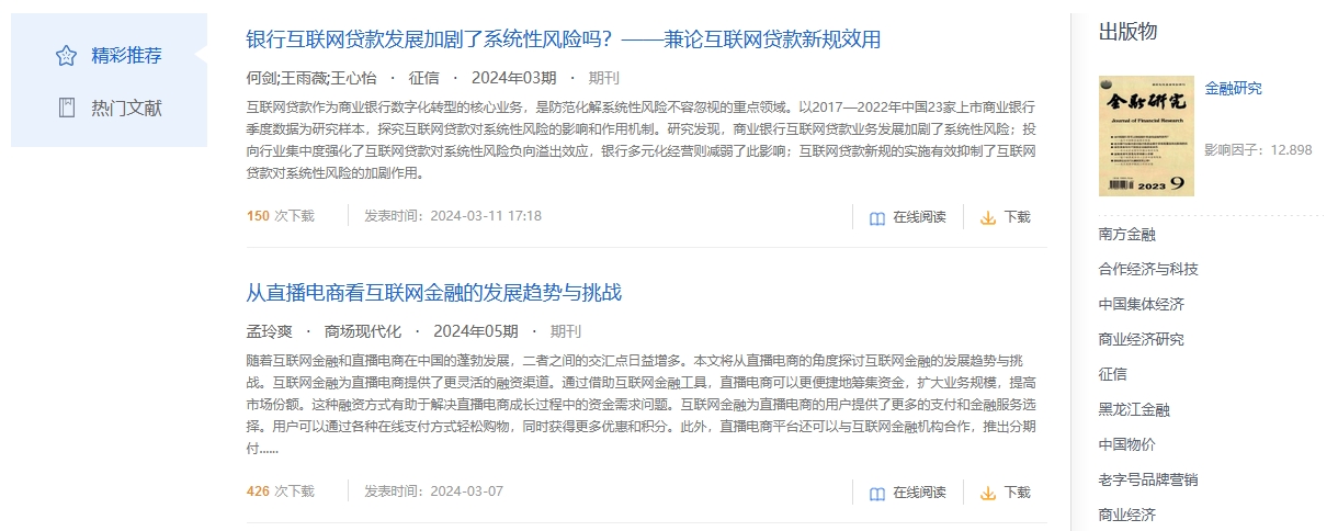 期刊关注页面显示已关注期刊的刊名、封面、影响因子、关注时间,并按发表时间降序显示期刊的文献列表,包括论文题名、作者、机构、来源等信息。点击文献标题,跳转至文献知网节页面。鼠标悬停到某篇文献,点击按钮可下载或收藏该篇文献。