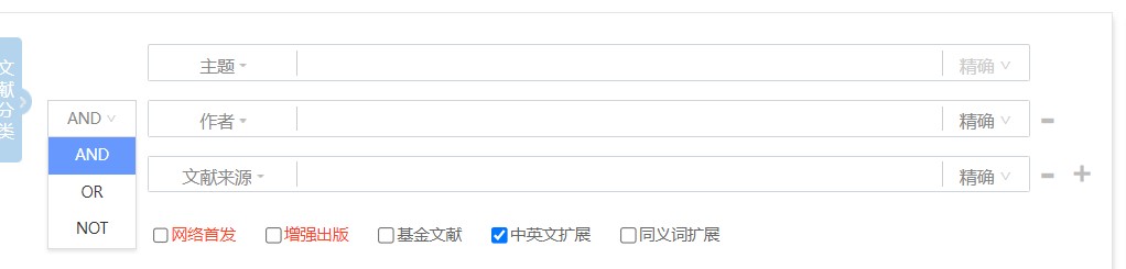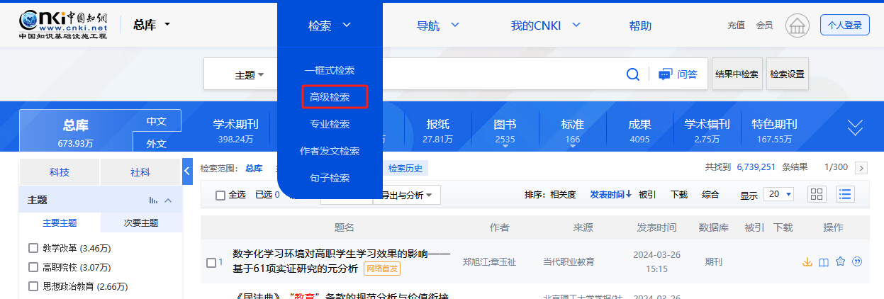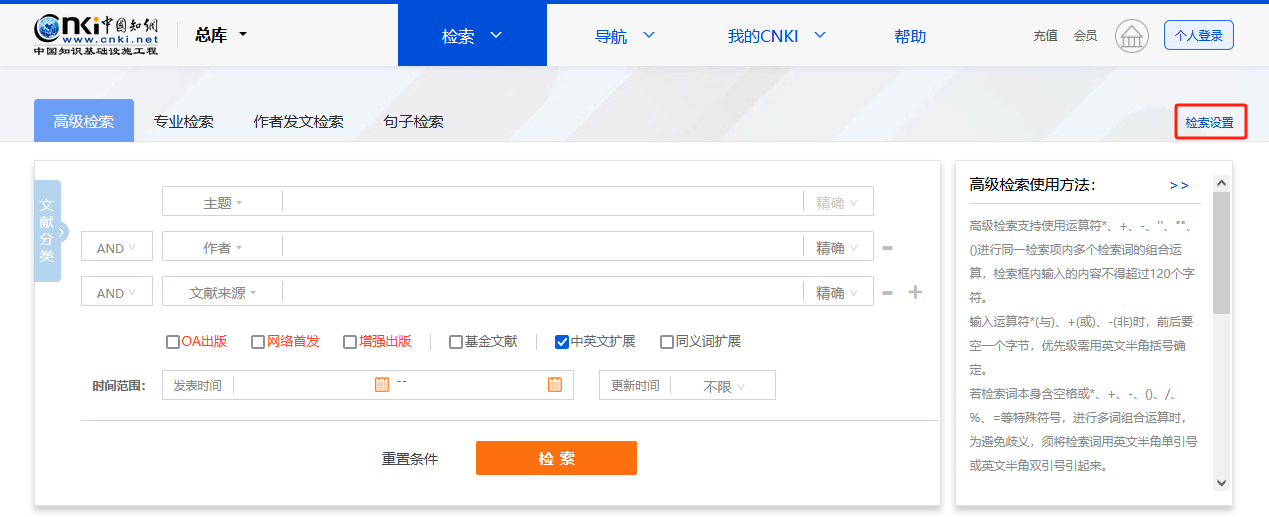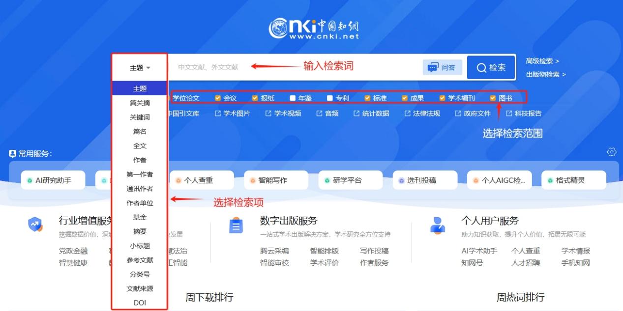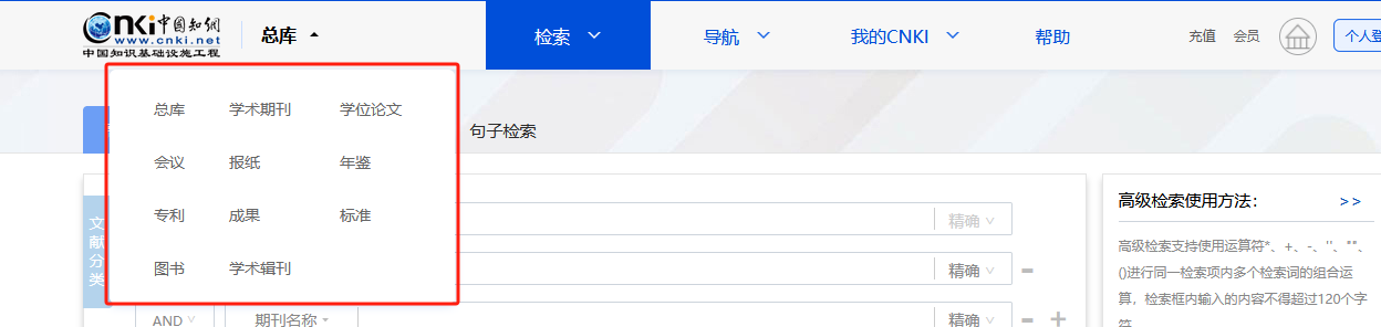 总库提供的检索项有:主题、篇关摘、关键词、篇名、全文、作者、第一作者、通讯作者、作者单位、基金、摘要、小标题、参考文献、分类号、文献来源、DOI