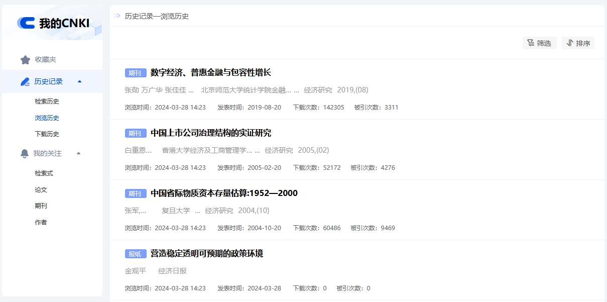 浏览历史为浏览文献知网节的记录,显示浏览过的文献类型、题名、作者、机构、来源、浏览时间等信息,支持按浏览时间筛选或排序。点击文献标题,跳转至该文献知网节页面。鼠标悬停到某篇文献,点击按钮可下载收藏该篇文献。
