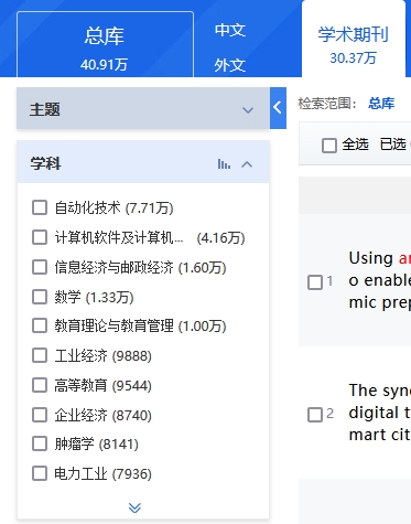 中国知网提供外文题录与中文资源的统一整合检索,通过对检索词的中英文扩展实现统一检索与发现,在没有选定中文的情况下,检索结果会包含外文题录数据。目前中国知网与超过60个国家及地区650余家出版社进行了版权合作,收录外文期刊7万余种,覆盖SCI90%SCOPUS80%以上,图书百万册。外文文献的全文获取可通过全文链接从合作的出版社获取。